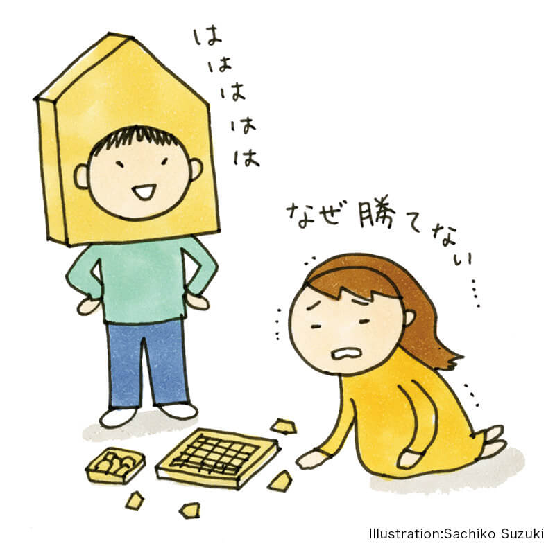 ポーカーを教えたら、めきめき上達し、そのうちすました顔でロイヤルストレートフラッシュを出す。神経衰弱ではカードをめくり続け、私よりも枚数を取るようになった。そして現在は、将棋に夢中だ。なんと私は、5歳児を相手に一度も勝てたことがないのだ。かつてのカードゲームのときみたいに、手加減をしているわけではなく、真面目に向き合って勝負している。