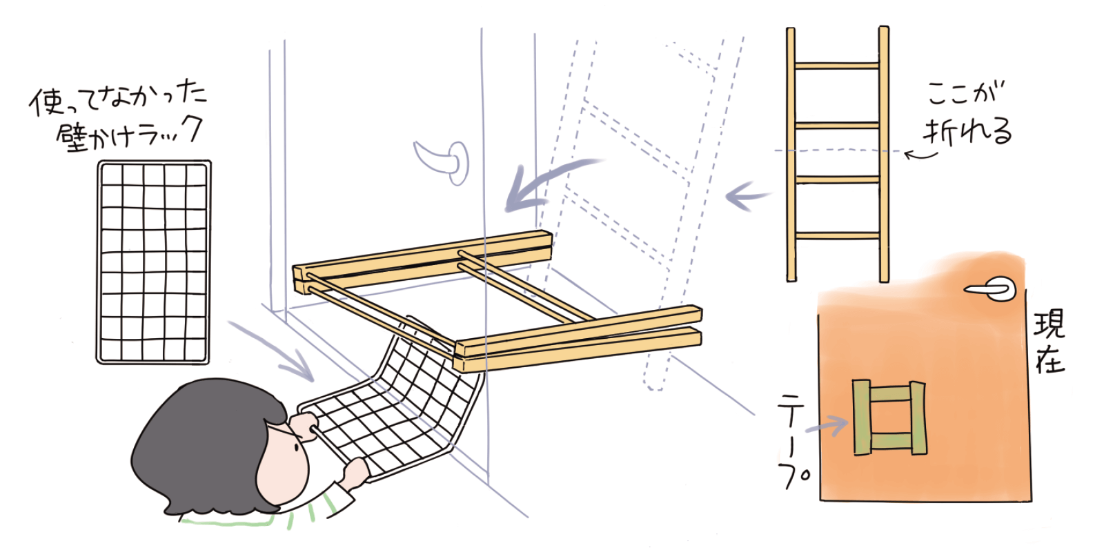 先日、台所にいたら階下からガタゴトッと派手めな音がした。数分後に息子がきて「ごめん、お風呂場のドアが開かなくなった」と言った。「ドア閉める時、タオル掛けが倒れて」。なんと。脱衣所の壁に立てかけてあるハシゴ型のタオル掛け。半分に折り畳めるのだが、部屋を出る時に腕に軽く触れた拍子に折り畳まれつつ倒れたらしい。そしてそのサイズが脱衣所の幅とほぼ同じだったようだ。ドア下の隙間1cmから携帯を入れてみると、室内は電気がついていてよく見える。いや消して出てよ…今回は助かるけど。まず下から押し上げようと、スチール製壁かけラックの一部を90度くらい曲げ、隙間から差し込んでグッと上げてみる。がっちりハマっている左の脚は壁際で難しく、少し浮いている右に当てたものの動くほどの力は加えられず。次に、上から荷造りテープを脚に引っ掛けて持ち上げてみた。でも抜けてしまったり、テープが切れたり。なので釣り糸や、100均でいろいろ買って創意工夫の2日間を過ごした。が、無理だったので賃貸の管理事務所に業者さんを呼んでもらった。