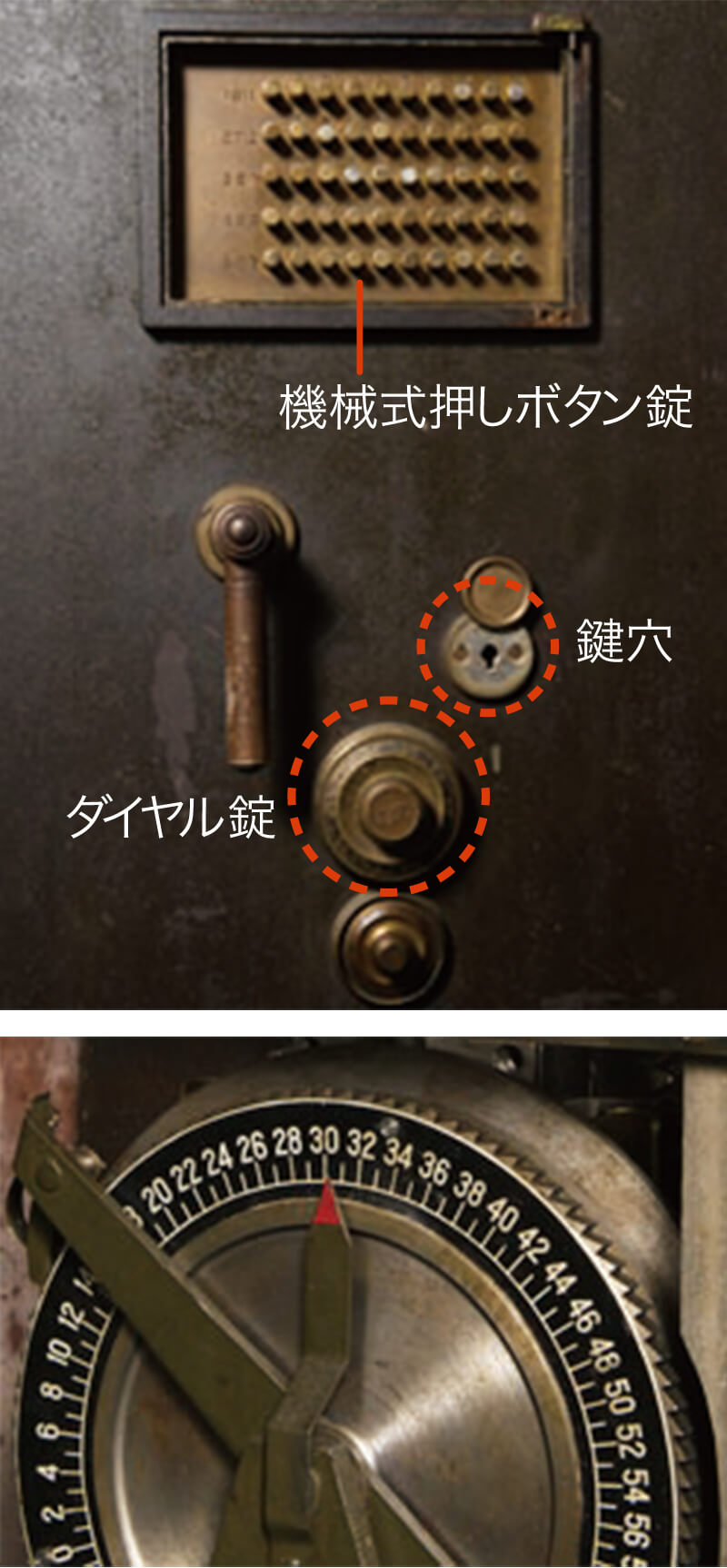軍用金庫は鍵の仕組みが外国に知られないよう純日本製です。扉にある「機械式押しボタン錠」のボタンは50個もあります。一般的な押しボタン錠はせいぜい10個だったそうですから、それだけ金庫破りも大変だったはずです。