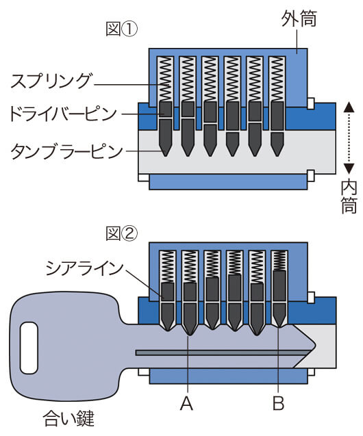 古代エジプト錠ではピンは1本の棒でしたが、ピンタンブラー錠のピンは2本に分断されています(図1)。ドライバーピンとタンブラーピンの切れ目「シアライン」をそろえることで鍵が回るようにしたのです。