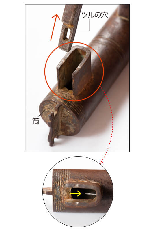 (上)鍵が開いているところ。筒の中に鍵の開け閉めをする閂が入っている。