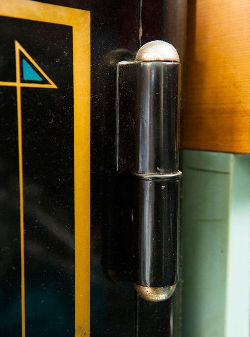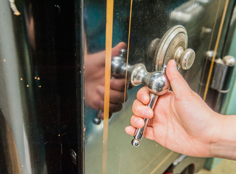 「ふつうは何年も使っていると、扉の蝶番(ちょうつがい)にガタがきます。少しずつ扉がかたむいて、ピッタリ閉まらなくなります」と、金庫と鍵の博物館の館長、杉山泰史さんは言います。扉と本体の間に隙間ができると金庫内の気密性が落ち、扉を開けても音はしません。この金庫は70~80年前のものですが、蝶番がしっかりとしていて、優秀な金庫です。