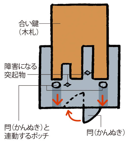 左上の写真の銀色のカバーの中身の図解。両側にひとつずつポッチがついている。 合い鍵(木札)を差し込み、ポッチを下まで押し込むと、閂(かんぬき)が引っ込んで鍵が開く仕組み。合い鍵の裏には中央の突起物を避けるためにスリットが入っている。突起物の位置が鍵によって異なるので、別の合い鍵では入らないのだ。