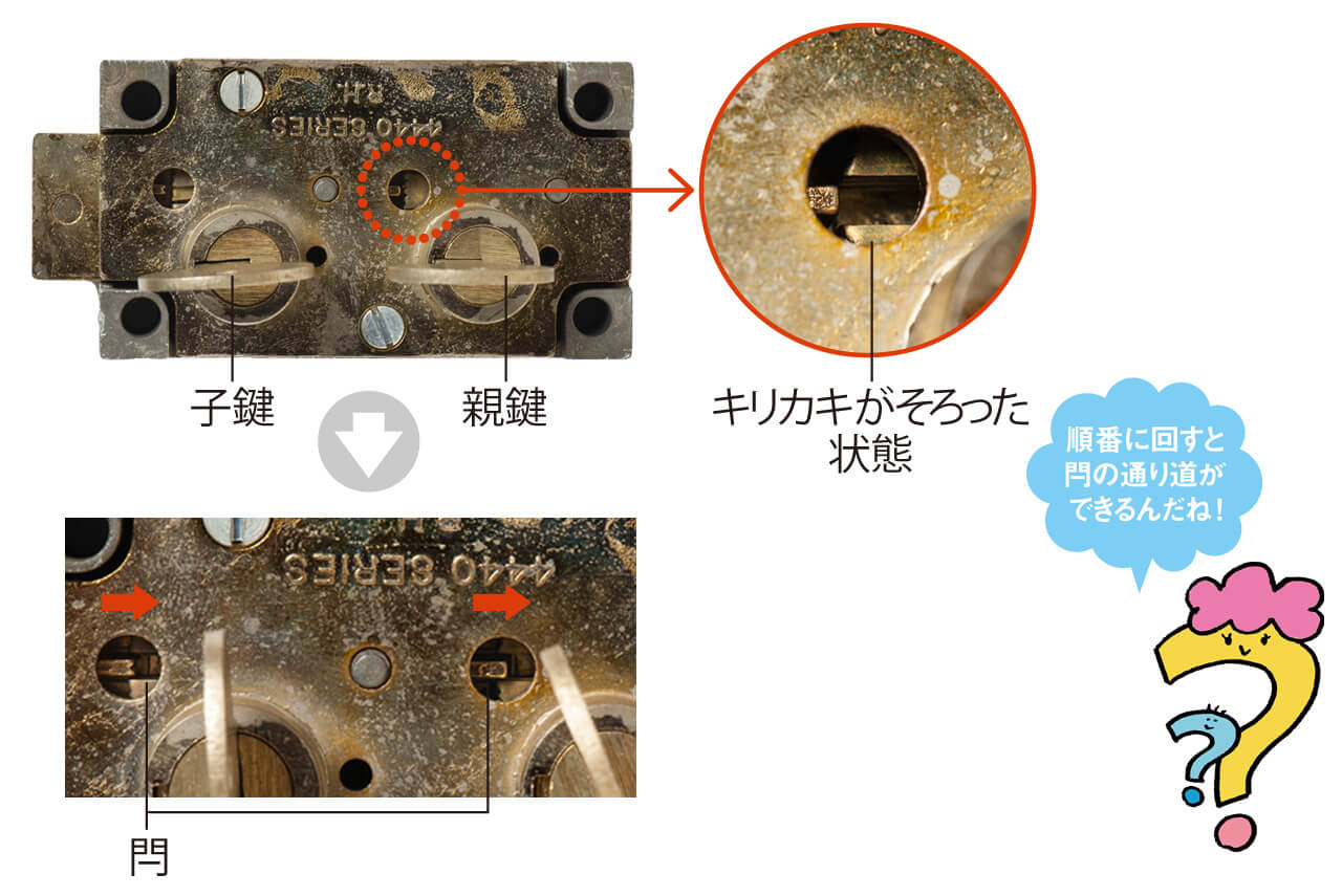 開錠するには、まず親鍵を回します。親鍵側のキリカキ(溝)の位置をそろえ、閂(かんぬき)が通る道をつくる。そして、子鍵を回すと子鍵側のキリカキがそろい、閂がそれぞれのキリカキに収まって、開きます。回す順番が逆だと開きません。