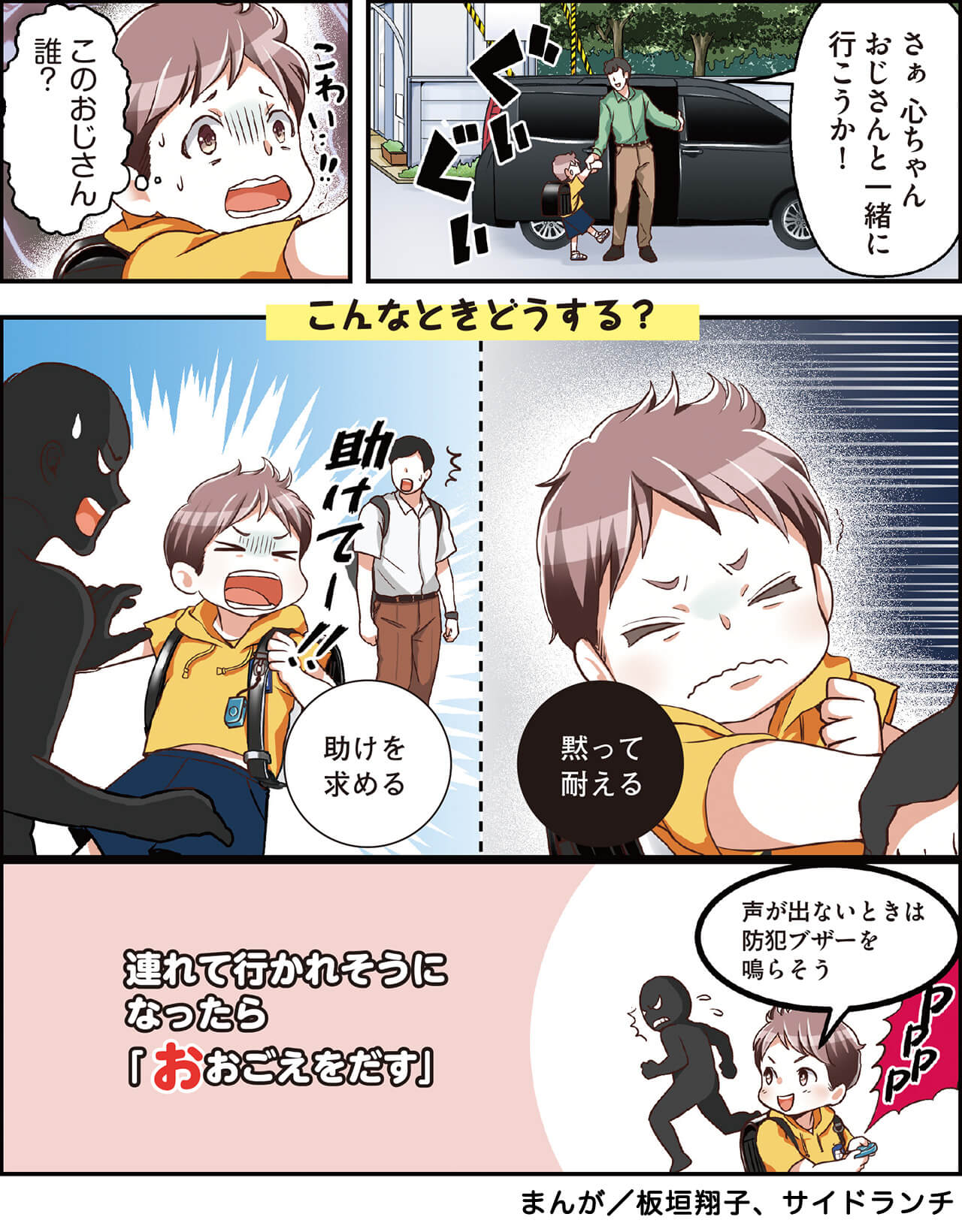 登下校など子供がひとりになった時、知らない人に追いかけられたり、無理やり連れていかれそうになったら、大きな声で「助けて」と言い、周りの大人に知らせることが大切です。 しかし、いざという時大きな声を出すのは大人でも難しいこともあります。 そんな時のために大きな声を出す練習をしてみましょう。また、大きな声の代わりになる防犯ブザーの使い方も親子で確認しておきましょう。