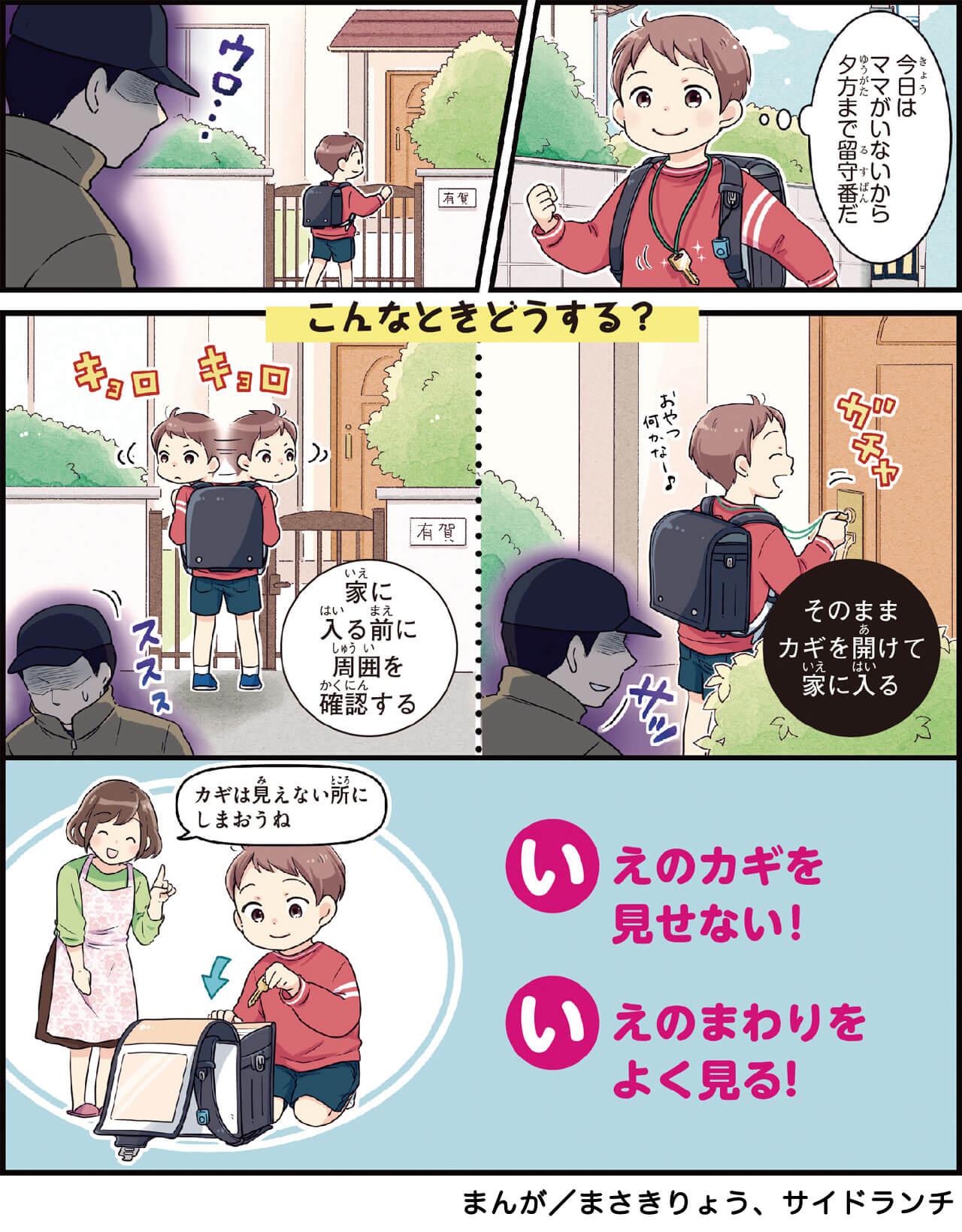 お子様に留守番を任せるとき、ついつい家の中で気を付けることに目が向きがちですが、実は留守番は家に入る前から始まっています。お子様には、家の鍵はお友達などに見せたりせずに、使う直前までランドセルやポケットから出さないことを伝えましょう。鍵をなくさない工夫もあれば、なお良いですね。また、家に入る前は周囲を確認して、知らない人がいないか、車やバイクが止まっていないか確認してから、すぐに家に入るよう伝えましょう。