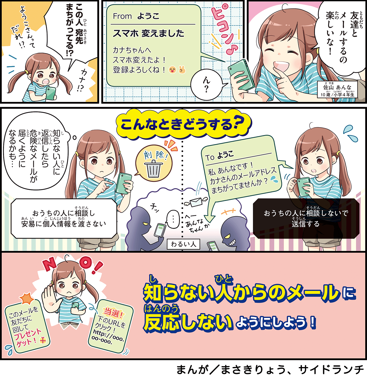 あなたを騙して連絡させようと、友だちのフリをしたメールが送られてくることもあります。連絡してしまうと、脅迫の連絡や危険なメールが届くかもしれません。知らない人からのメールには反応せずに削除するようにしましょう。また、知らないメールアドレスから送られてくるファイルやURLの中には、開くとスマホが使えなくなったり個人情報が盗まれるものもあります。むやみにクリックをするのは危険です。