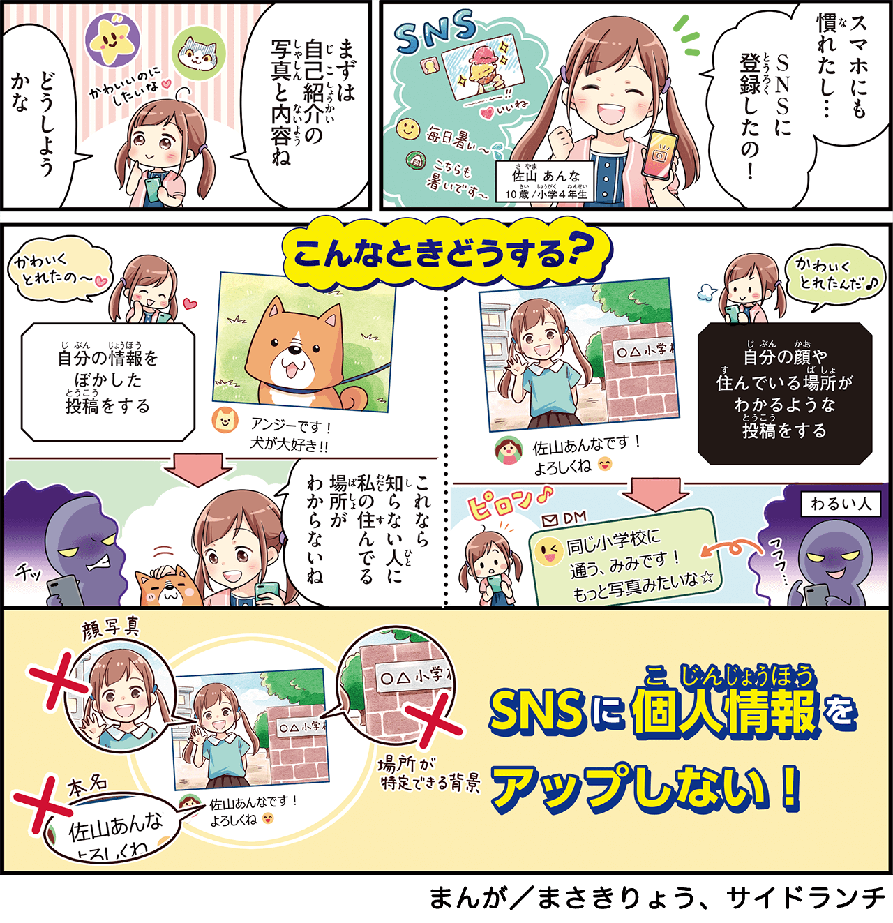 SNSは、お友達や共通の趣味を持つ人と楽しく交流ができる一方で、注意しなければならない点もあります。その中の1つが、個人情報の公開です。SNS上に個人情報を公開してしまうと、完全に削除することはできません。怖い目にあったり、あなたの家族やお友達、周りの人たちが犯罪に巻き込まれたりしてしまいます。一部では、年齢制限を設けているSNSもありますので、ルールとあわせて、親子で確認してみましょう。