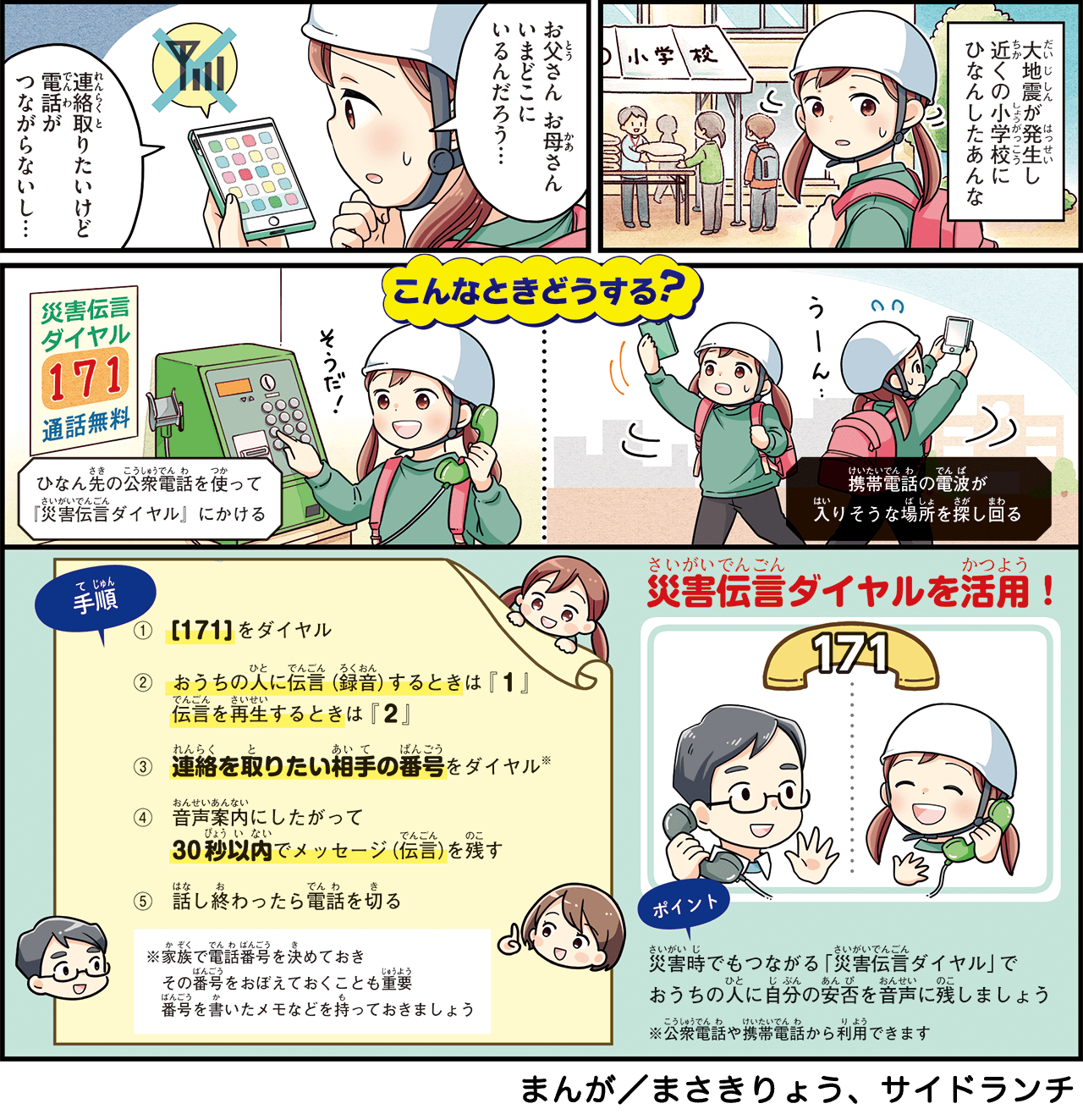 地震などの災害が発生すると電話が繋がりにくくなることがあります。そんな時は災害用伝言サービスを利用することで家族の安否を確認したり、自分の状況を伝えたりすることができます。公衆電話から伝言を録音再生する場合の通話料は無料です。 毎月1日、15日、正月三が日、防災週間など定期的に体験利用もできるので災害に備えて家族で練習してみましょう。※災害用伝言ダイヤルは加入電話(プッシュ回線、ダイヤル回線)、公衆電話、ISDN、携帯電話、IP電話からご利用いただけます。