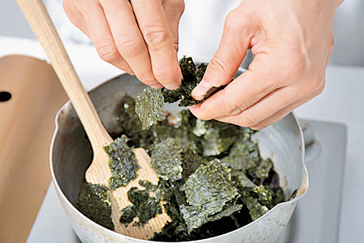海藻の佃煮は湿気ってしまった海苔で作っても大丈夫。黒すりごまを加えて栄養効果をアップさせてもいいですね。ごはんのおともとしてお弁当に入れてもいいですし、納豆やゆで野菜に混ぜるなど和え物にも重宝します。ひき肉と一緒に炒めてうどんにのせればジャージャー麺風に、和風スパゲッティの具にしてわさびを添えてもおいしいですよ。
