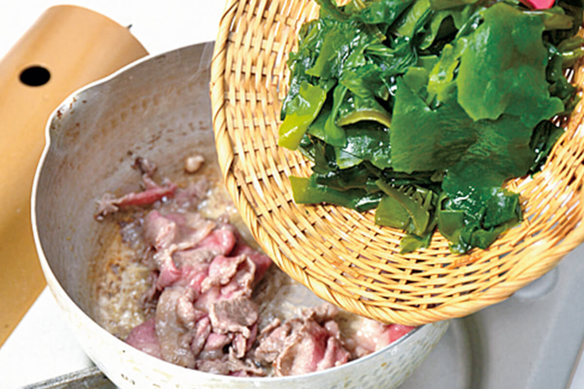 わかめと牛肉をよく炒めるのがコクを出すコツ。作った翌日はさらにおいしくなりますよ。