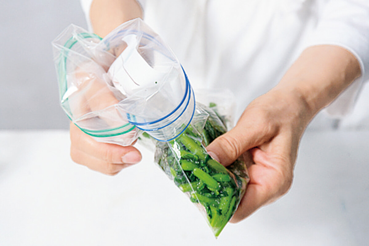 ひじきは水でもどす。ペーパータオルで包み、水けをしっかりしぼる。