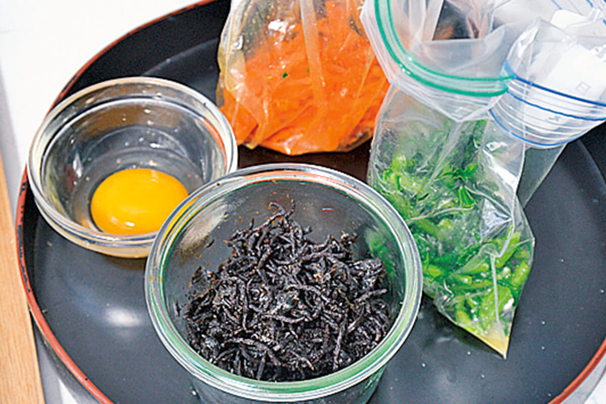 海藻の黒、ナムルの緑と赤、卵の黄、ナッツの白、トッピングが5色になるようにすると見た目も美しく栄養バランスもよくなります。佃煮をのせる量は好みで増減してください。
