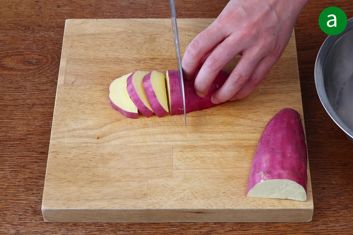 さつまいもはよく洗い、a皮ごと厚さ1cmの半月切りにし、水に5分さらしてから水気を切る。玉ねぎは1cm幅のくし形切りにする。