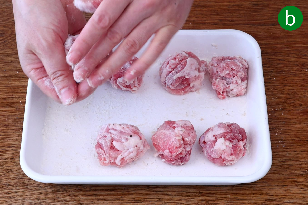 [A]を小さめのボウルに混ぜあわせる。バットに豚こま切れ肉を広げ入れ、塩、胡椒を振ってなじませる。小麦粉を加えてさっと混ぜ、b8等分にして丸める。