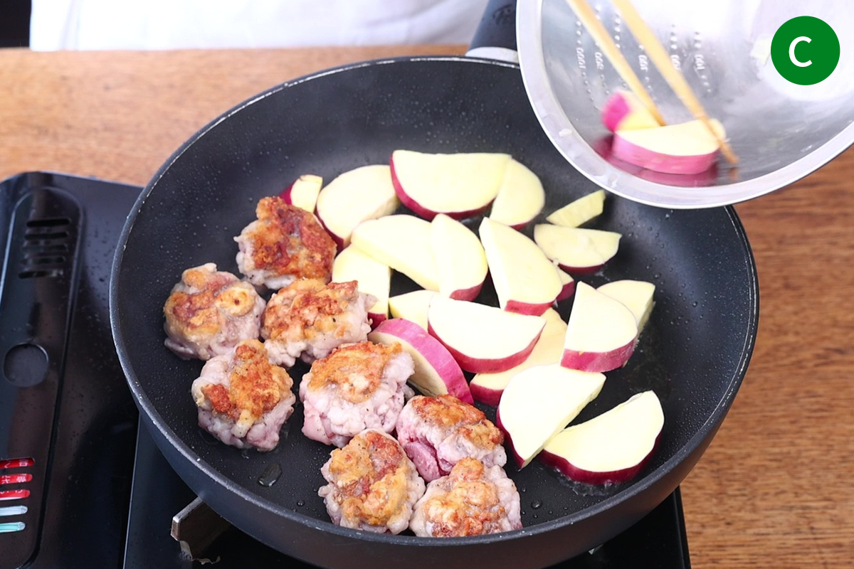 玉ねぎを加え中火にし、さっと炒める。玉ねぎが透き通ってきたらc空いたところにさつまいもを広げ入れる。水(大さじ2)を加えてふたをし、弱火で4分蒸し焼きにする。
