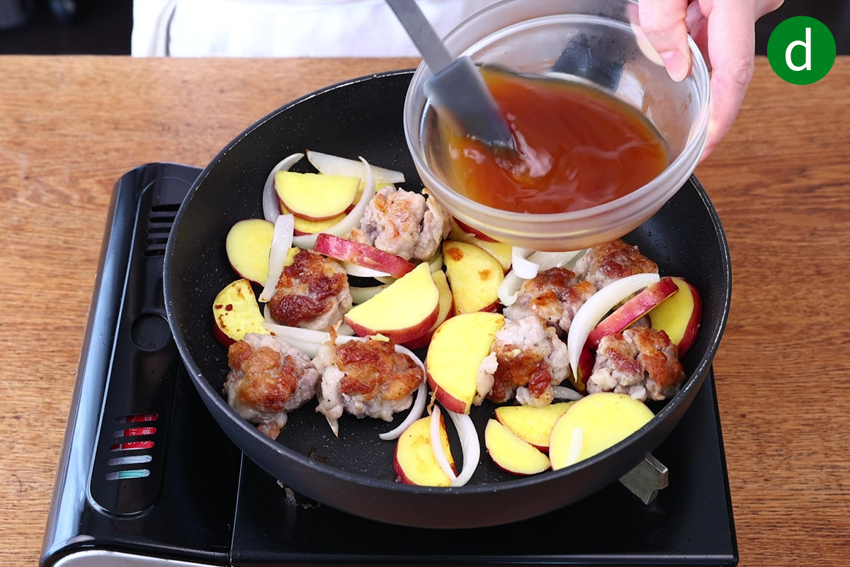 玉ねぎを加え中火にし、さっと炒める。玉ねぎが透き通ってきたらd[A]をもう一度混ぜてから回し入れ、全体にからめながら、とろみがつくまで炒める。