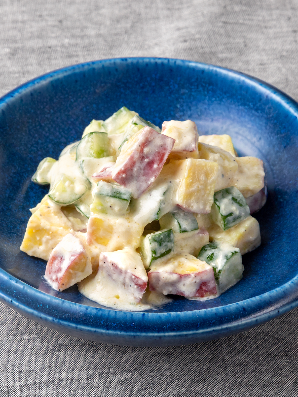 さつまいもは1.5cm角に切って耐熱ボウルに入れ、水に5分さらして水気を切る。ふんわりとラップをかけてレンジで3分(600w)加熱し、ラップを外して粗熱をとる。きゅうりは縦4等分に切って、幅1.5cmに切る。塩を振って5分おき、さっと洗って水気をふく。