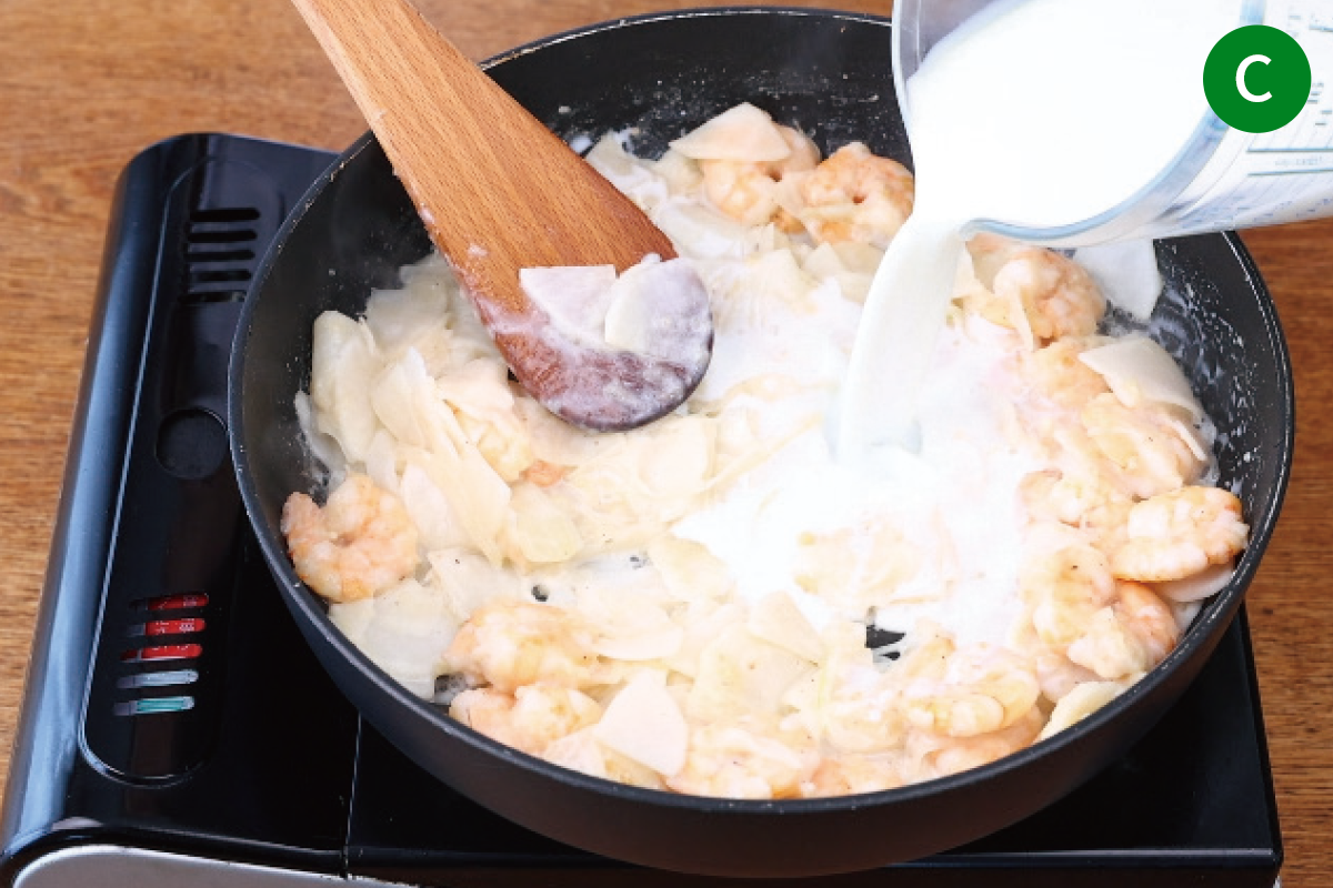 小麦粉をえびにまんべんなく振りかかるように入れ、粉っぽさがなくなるまで1分ほど炒める。c牛乳を3回に分けて加え、都度よく混ぜる。