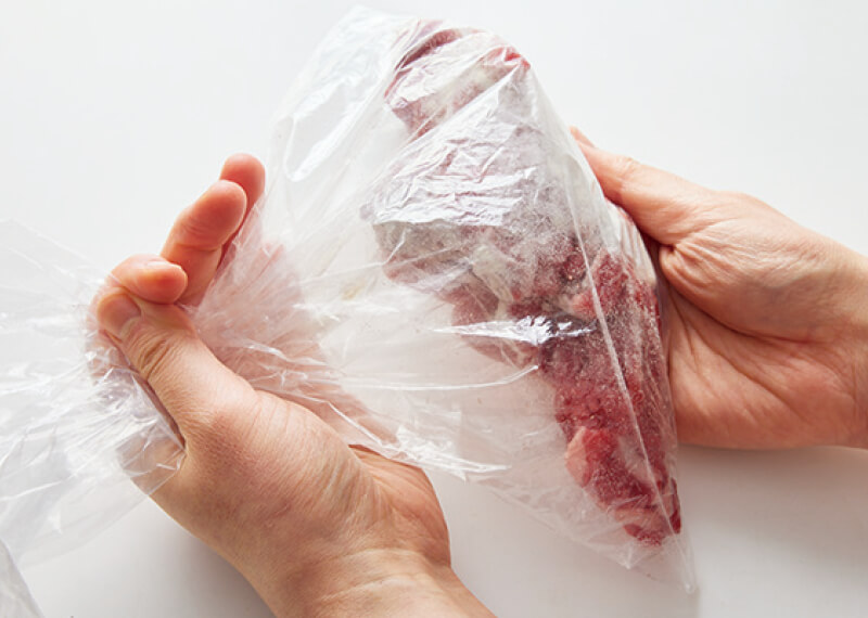 牛肉はポリ袋に入れて塩・こしょうを振り、さらに小麦粉を振り入れ、軽く揉みこむ。玉ねぎは5mmの厚さにスライス、マッシュルームとミニトマトは半分に切る。