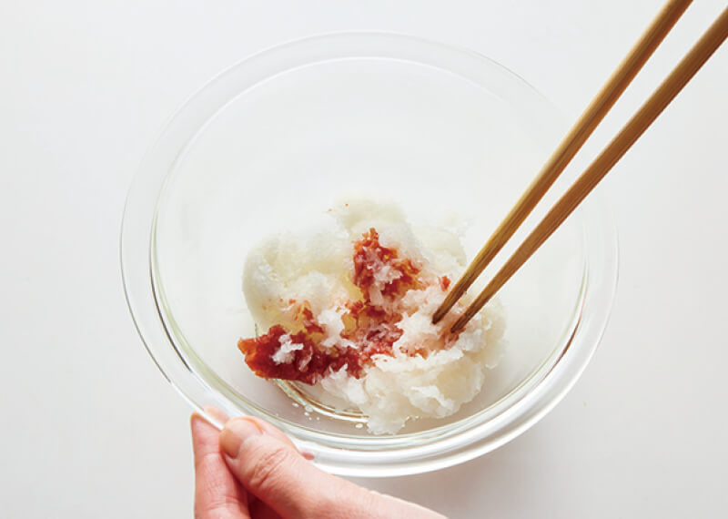 梅干しは種を除き、包丁でたたく。大根をすりおろし、キッチンペーパーで包んで軽く水気を切り、梅干しと混ぜ合わせる。