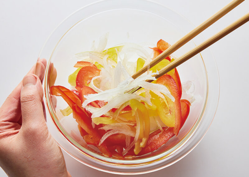 豚肉に酒を振る。玉ねぎは薄くスライスし、5分ほど水にさらしたあと、水気を切る。パプリカは薄切りにする。