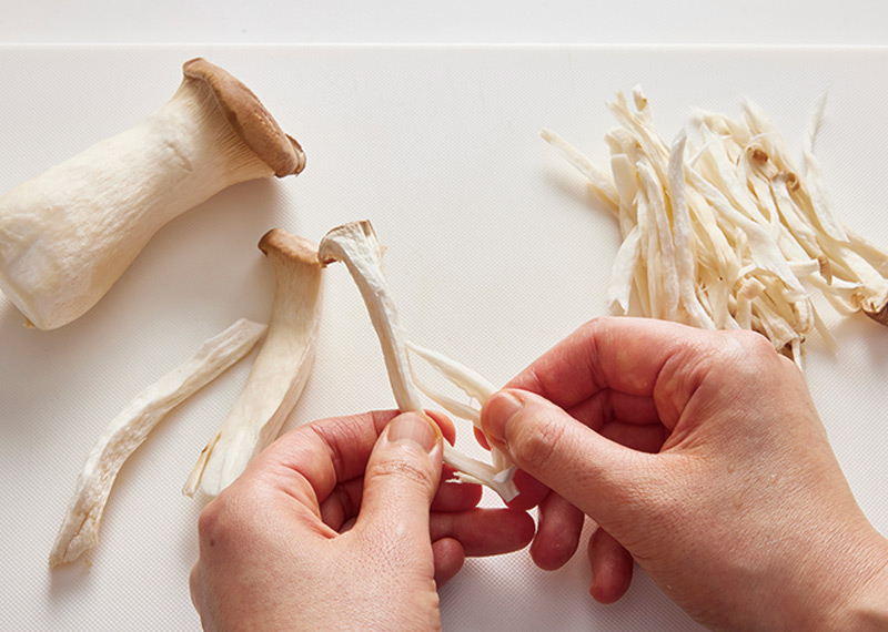 エリンギは手で細く裂き、舞茸は大きめにほぐす。にんじんは短冊切り、小ねぎは5cmの長さに切る。