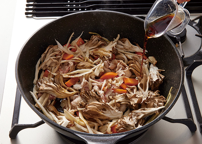 豚肉の色が半分ほど変わったら(A)を入れて全体を混ぜ、豚肉に火が通ったらいったん取り出す。