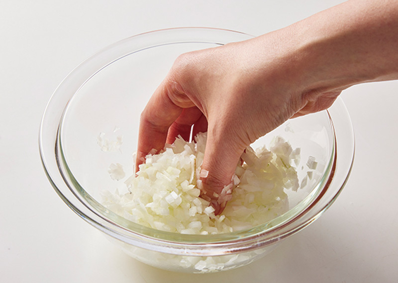 玉ねぎはみじん切りにして耐熱ボウルに入れ、塩を加えて軽く揉み、ふんわりとラップをかけて600Wの電子レンジで2分加熱し、粗熱をとる。