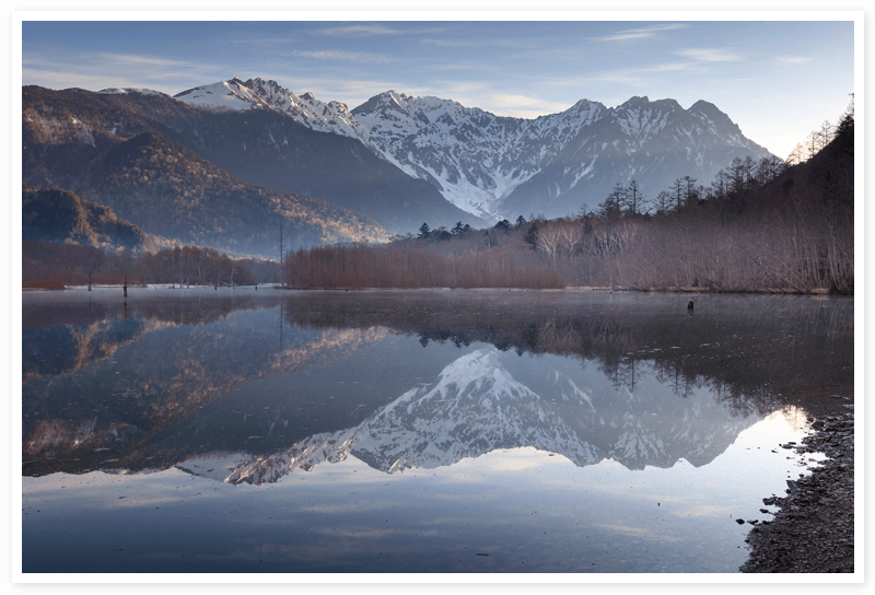 大正池は、松本市上高地にある湖。1915年、上高地の西にそびえる焼岳(やけだけ)が噴火した際に、ふもとを流れる梓(あずさ)川が堰(せ)き止められてできた。現在の湖の大きさは、周囲2.4キロ、最深部3.9メートル。標高1490メートルに位置し、真夏でも朝晩は冷え込む。昼夜の激しい気温差によって早朝になると濃い靄(もや)が生じ、淡いブルーの湖面をおおう。朝靄が晴れるにつれて、湖水の向こうに徐々に姿を現す穂高連峰が美しい。