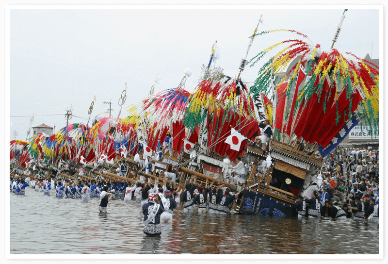 防犯対策・セキュリティ・警備会社のALSOK TOP ホームセキュリティTOP安心生活サポートWEBマガジン Always 歳時記 風治八幡宮 川渡り神幸祭 歳時記 vol.18 風治八幡宮 川渡り神幸祭 福岡県田川市 筑豊に初夏を告げる風物詩として、福岡県五大祭りのひとつに数えられる「川渡り神幸祭(じんこうさい)」。その昔、疫病が流行した際に氏神である風治八幡宮に平癒祈願をしたところ成就したため、そのお礼に奉納したのが始まりとされ、450年以上も続く。 2基のみこしと色鮮やかなバレンを飾った11台の山笠が彦山川を押し渡る様は、勇壮かつ絢爛。毎年5月の第3土・日の2日間で行われている。 みこしと山笠が、五穀豊穣や無病息災を祈って川を渡る。