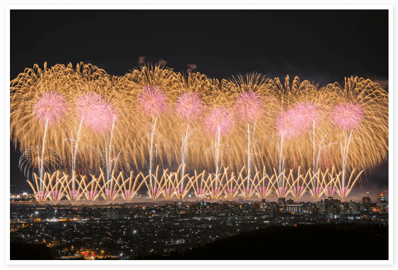 毎年8月2、3日の2日間で2万発を打ち上げ、なかでも直径650mもの大輪となる“正三尺玉”や、打ち上げ幅1.7㎞にも及ぶ復興祈願花火フェニックスが名物。祭の起源は、1945年8月1日の長岡空襲の慰霊鎮魂を願って翌1946年に行われた「長岡復興祭」。戦争によって中止されていた花火大会と融合する形で行われるようになった。