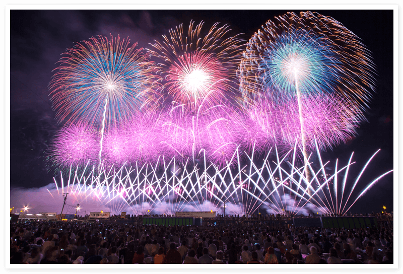 防犯対策・セキュリティ・警備会社のALSOK TOP ホームセキュリティTOP安心生活サポートWEBマガジン Always 歳時記 大曲の花火 歳時記 vol.24 大曲の花火 秋田県大仙市大曲地区 内閣総理大臣賞や経済産業大臣賞など、授与される賞からもその権威がうかがえる国内有数の花火大会。100年を超える歴史を誇り、当初から競技として大会が運営されていることが特徴。この大会でしか見られない「昼花火の部」、世界一華麗な美を競う「10号玉の部」、丸型花火の概念を破った「創造花火の部」の3部構成で開催される。 大規模な会場で桟敷席なども設けられている。