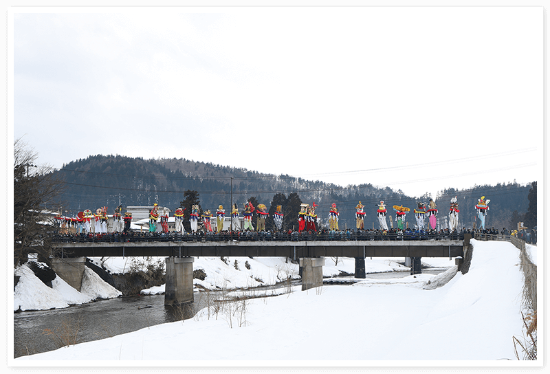 防犯対策・セキュリティ・警備会社のALSOK TOP ホームセキュリティTOP安心生活サポートWEBマガジン Always 歳時記 旭岡山(あさひおかやま)神社梵天(ぼんでん)奉納祭 vol.28 旭岡山神社梵天奉納祭 秋田県横手市 奥羽山脈に抱かれた横手市は、冬になるとたくさんの雪がふる。旧暦の小正月には、かまくらを作って水神様を祀った。この風習を観光化したのが2月の「横手の雪まつり」であり、その掉尾(ちょうび)を飾るのが「梵天奉納祭」である。この奉納祭も小正月の風習で、300年の歴史があるという。神の依り代(よりしろ)である梵天を各町や各団体が先を競って旭岡山神社に奉納する。 写真提供:横手市観光協会 竿の先につけられたきらびやかな頭飾りが雪に映える。