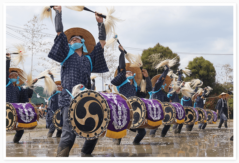 早乙女たちの後ろでは、大太鼓や小太鼓、鉦(かね)などの楽器の奏者が盛んに囃したてる。写真の原田はやし田は5月の最終日曜、新庄のはやし田は5月の第2日曜に開催されている。