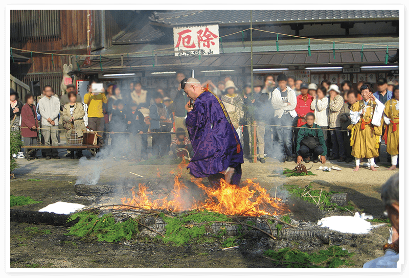 火渡り荒行は、燃えている炎の上を素足で渡り、厄を落とす神事。山伏が先頭で火渡りを行った後に、一般の参拝者も参加が可能。