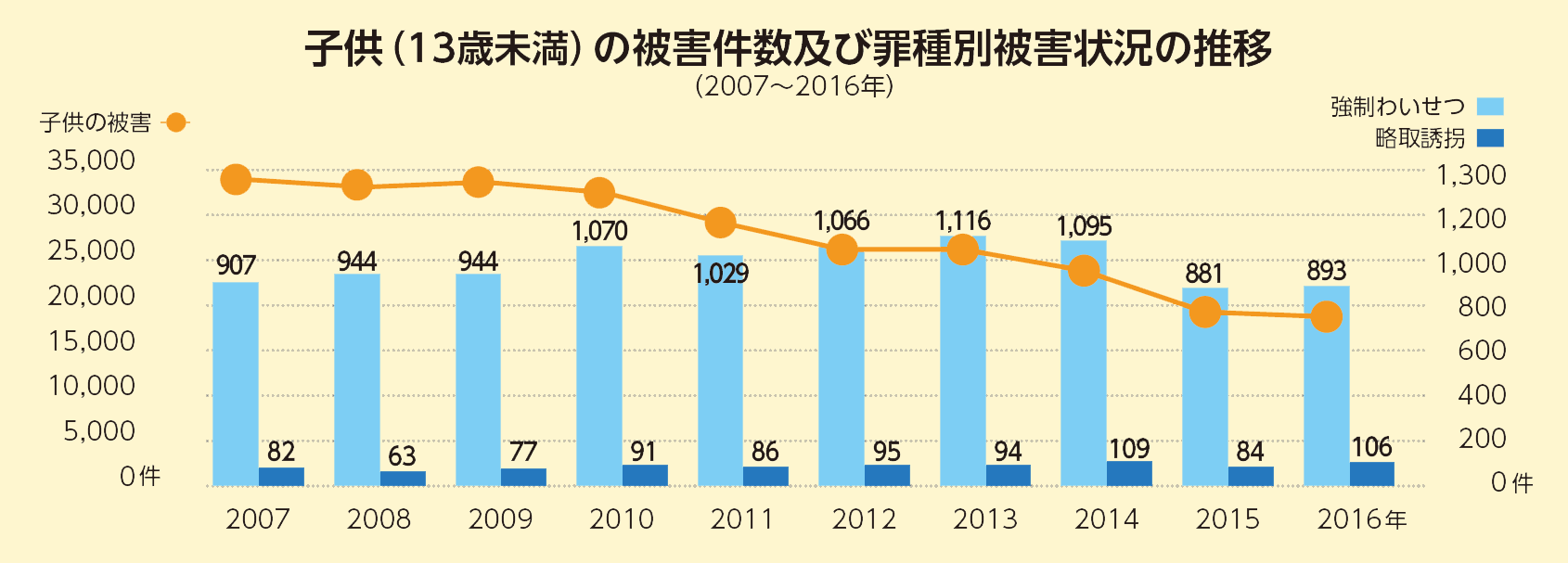 「平成29年『警察白書』子供(13歳未満)の被害件数及び罪種別被害状況の推移」を見てみると子供(13歳未満)の被害件数は10年前に比べて減ってはいますが、それでも年間1万7千件を越える事件が発生しています。罪種別では略取誘拐や強制わいせつなどは2015年より増加しています。また、数字の上には出てこない未遂事件も多発しています。