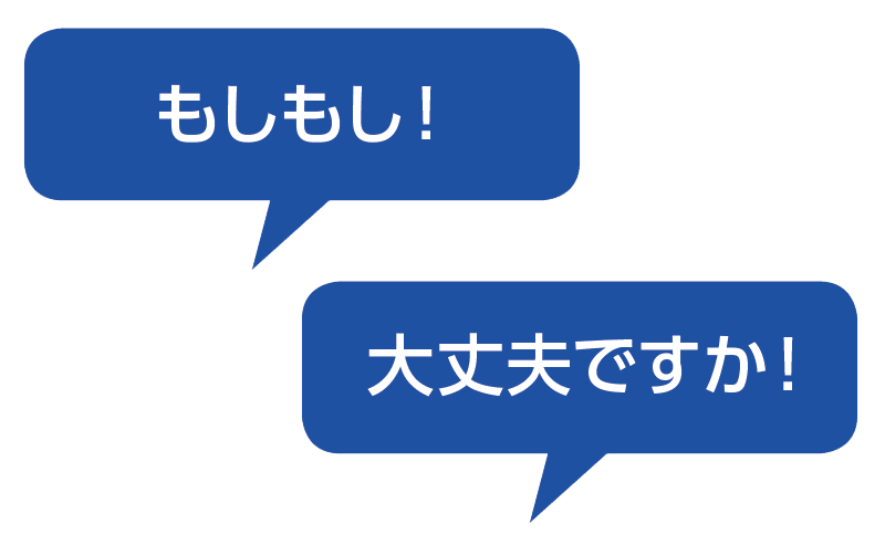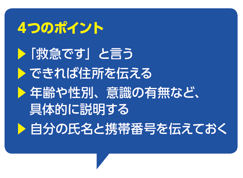 そばに誰かがいれば、その人に119番への通報を頼みます。自分が通報するときは、最初に「火災か、救急か」をはっきり伝えましょう。場所は正確に、できれば住所を言います。 わからなければ、目印になるものを伝えます。「30代くらいの男性が倒れています。声をかけても反応がありません」と具体的に状況を説明し、最後に自分の氏名、携帯番号などの連絡先を伝えましょう。