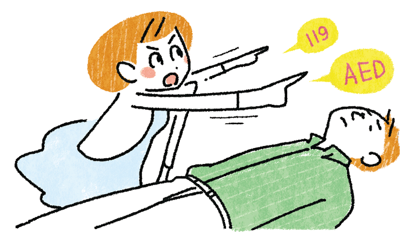 近くの人に「あなた、AEDを持ってきてください」と具体的に指示します。もしだれも近くにいない場合は、すぐ近くにAEDがあると分かっているときだけ、自分で取りに行きましょう。