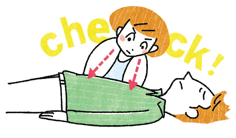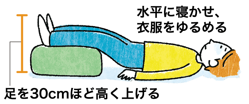 ショック症状(冷や汗、呼吸が速い、顔色が青白い)があるときは、ショック体位を取らせます。低体温の場合は、さらに毛布や衣服をかけて保温します。
