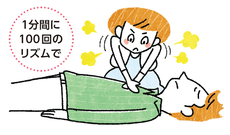 胸の中心に片手を置き、もう一方の手を重ねます。ひじを伸ばして垂直に体重をかけ、胸が5㎝沈むくらいの力で、1分間に100回ほどのリズムで胸を圧迫します。人工呼吸が可能なら、胸骨圧迫30回、人工呼吸2回のサイクルで行ってください(感染防護具がない、人工呼吸に抵抗がある場合などは省略します)。AEDが到着したら、以降は音声ガイドにしたがって電気ショックと胸骨圧迫を繰り返します。