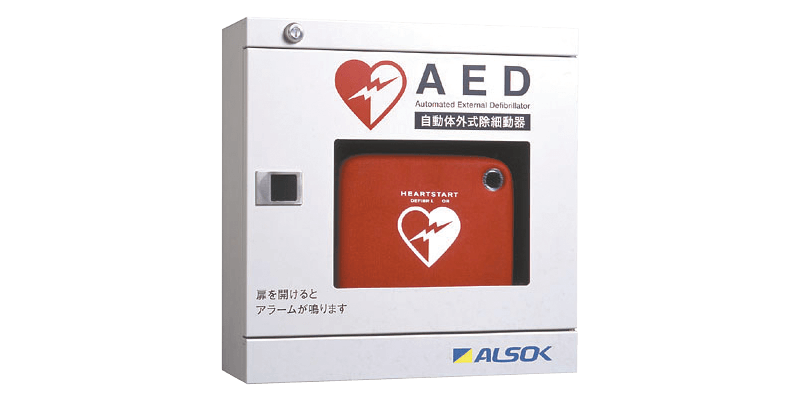 機能を停止した心臓に電気ショックを与え、正常な機能を回復させる医療機器です。学校や会社、駅、公共施設など、人が多く集まる場所を中心に設置されています。一般の人でも操作でき、操作方法は音声ガイドで案内されます。電気ショックが必要かどうかはAEDが自動で判断するので、意識がなく、呼吸がない場合には迷わず使用しましょう。