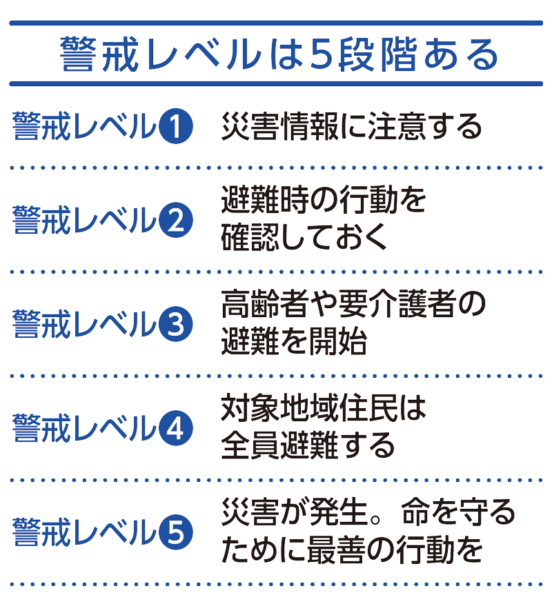 市町村からの避難情報は、テレビやラジオ、インターネット、防災無線、広報車などによって伝えられます。特に、避難の指標となる「警戒レベル」の変化を逃さないように注意してください。災害時の状況は刻一刻と変化します。情報はこまめにチェックしましょう。