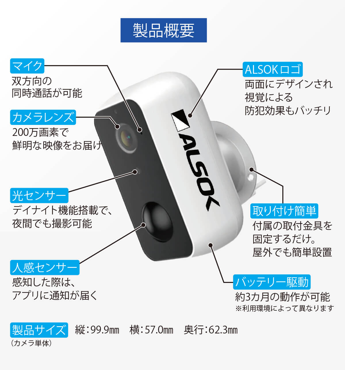 ご家庭の安全を守る〈HOME ALSOK〉に、新型防犯カメラがラインアップしました。屋外に設置可能、かつコンパクトなIPカメラで、バッテリー駆動とWi-Fi接続により電源やネットワークの配線工事が不要。専用アプリで、いつでも簡単に映像を確認できます。