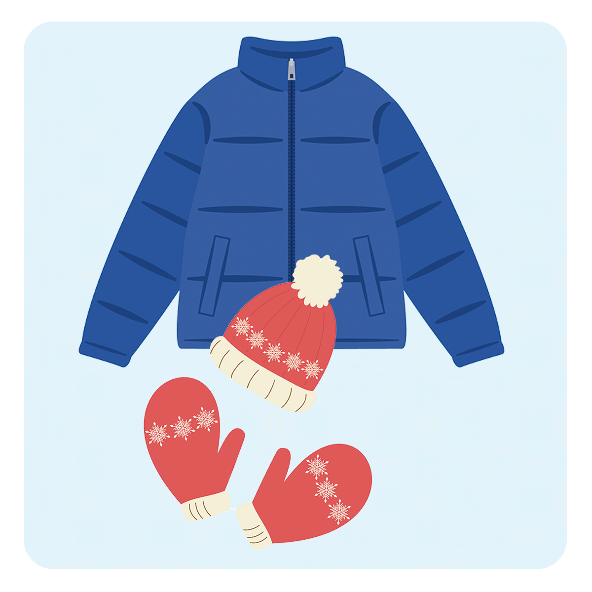 ダウンジャケット、ジャンパー、厚手の長袖・ズボン、厚手の靴下、手袋、マフラー、ニット帽など。避難所などへ移動する際になるべく重ね着して、多くの防寒着を持ち出しましょう。