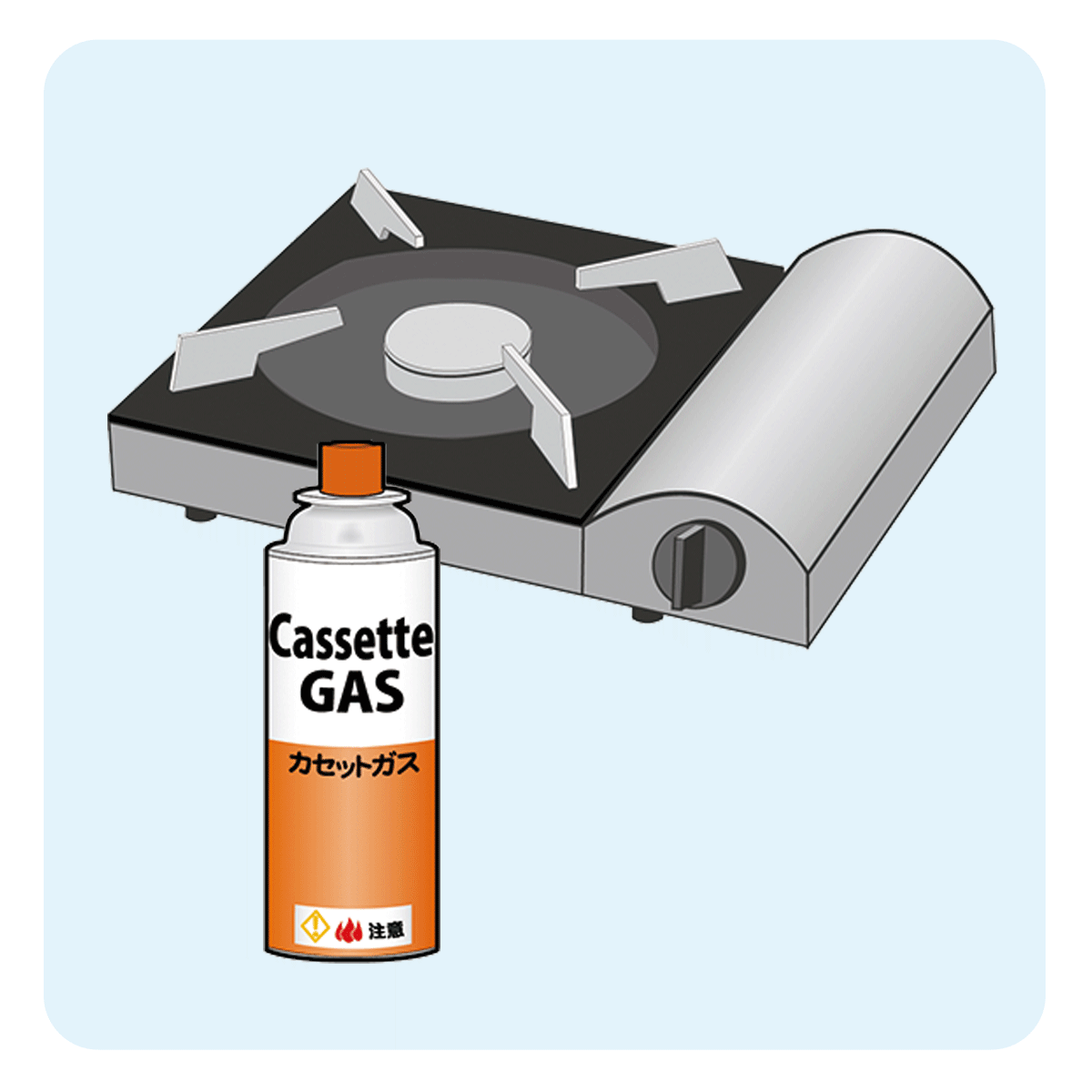 電気やガスが止まってもお湯を沸かしたり調理ができるように、カセットコンロを用意しましょう。温かい食事で心身を温められます。ガスボンベ1本で約60分使用可。大人1人につき1週間で約6本が目安です。多めに備蓄を。