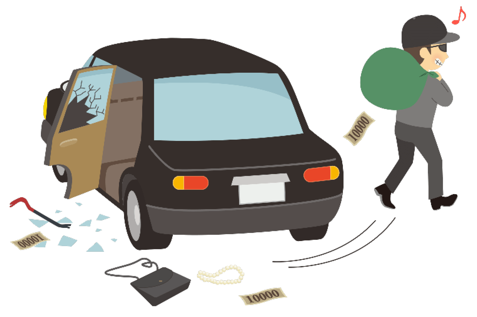 - 自宅の駐車場に停めていた車のガラスが割られて貴重品が盗まれた。