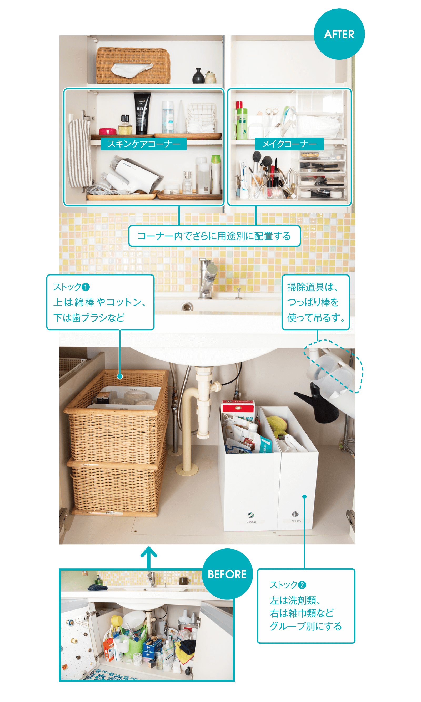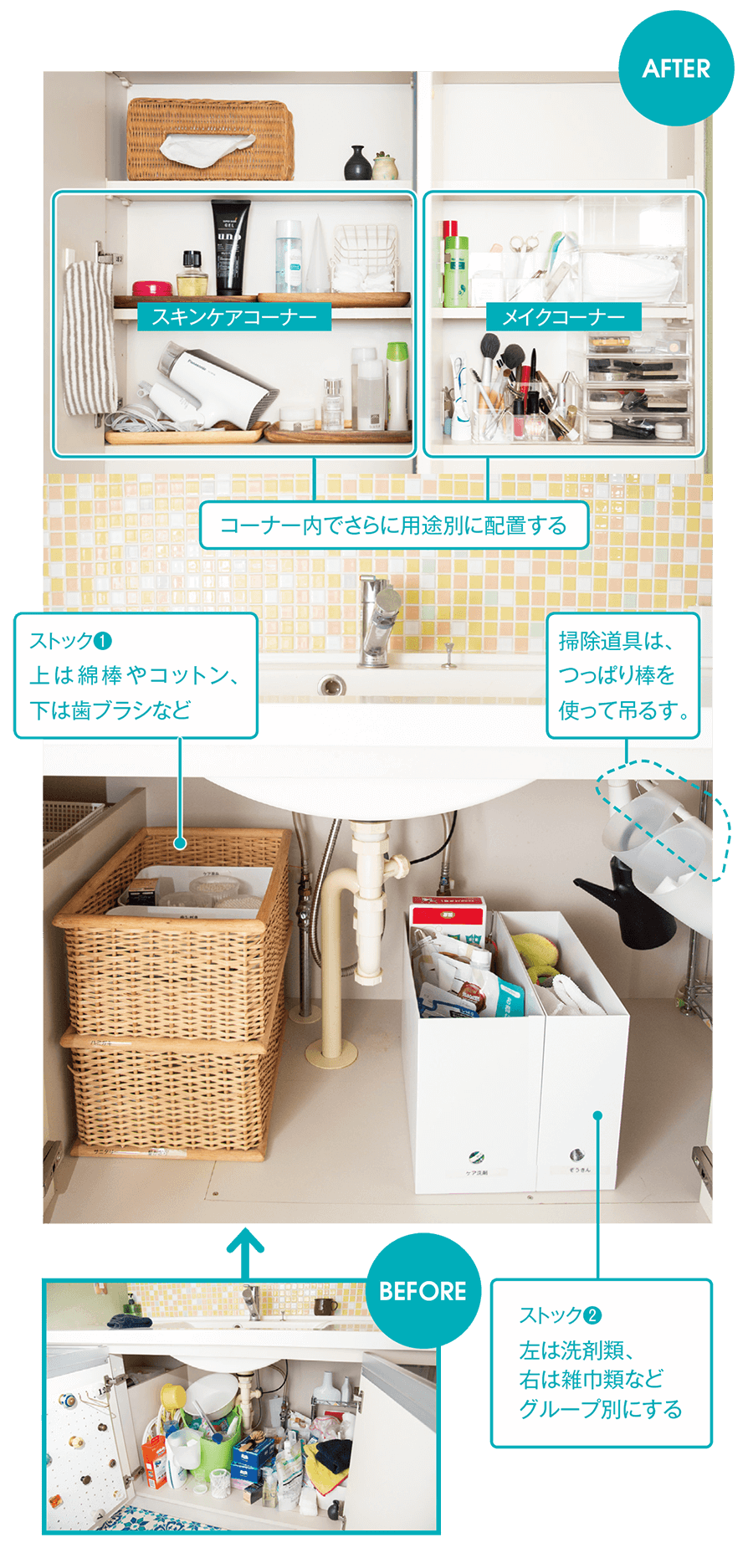 洗面台の上にスキンケアやメイクグッズ、下に掃除道具やストックなど、目的に合わせたグループをつくってまとめて置けば、探している物をストレスなく見つけられます。
