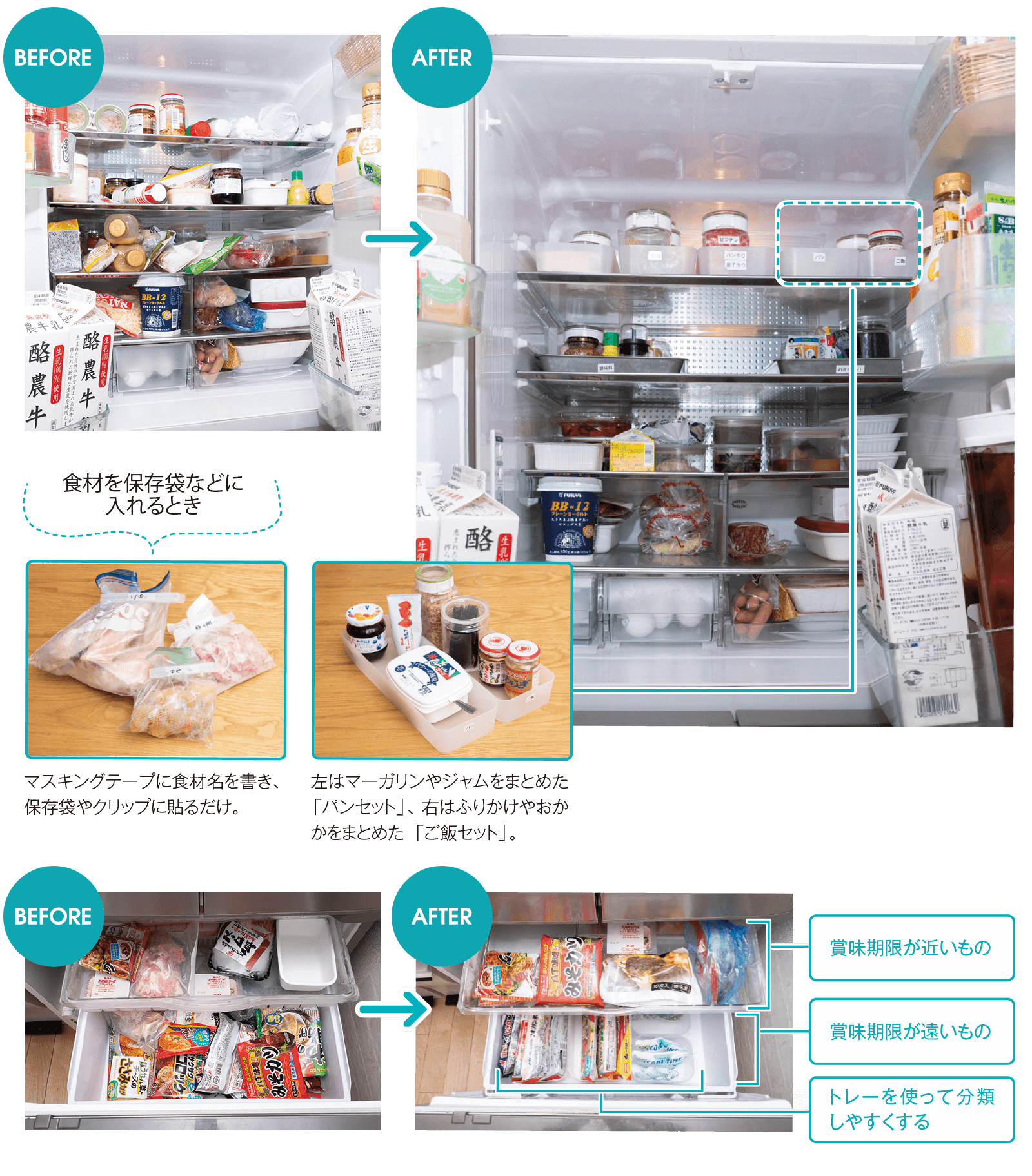 開封済みや賞味期限が近い食材は、引き出し上のトレー部分や手前に、遠いものは下や奥に置くなどルールを設けると、食品ロスの防止に有効です。