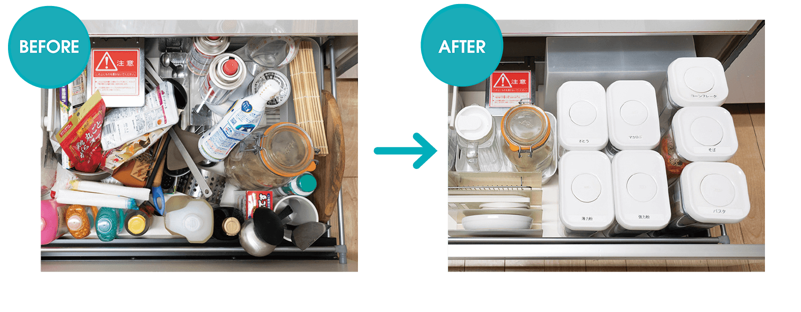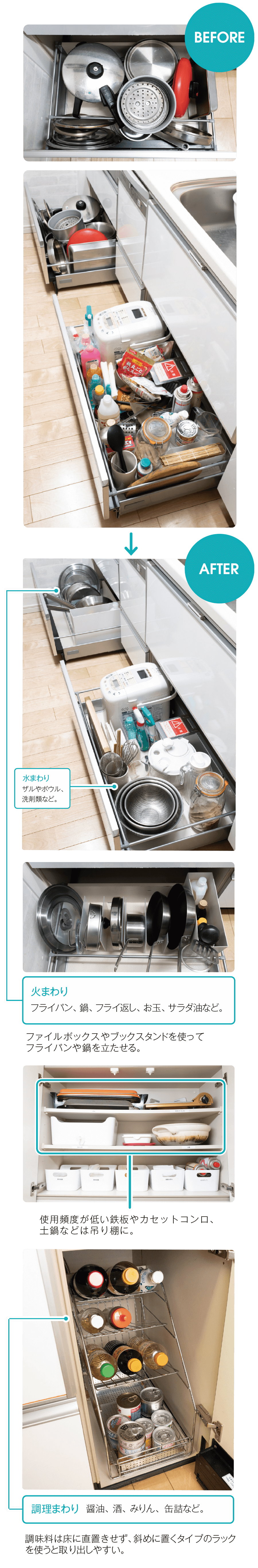 今回は、アイテムの数が多いため、機能的に収納したいキッチン下です。